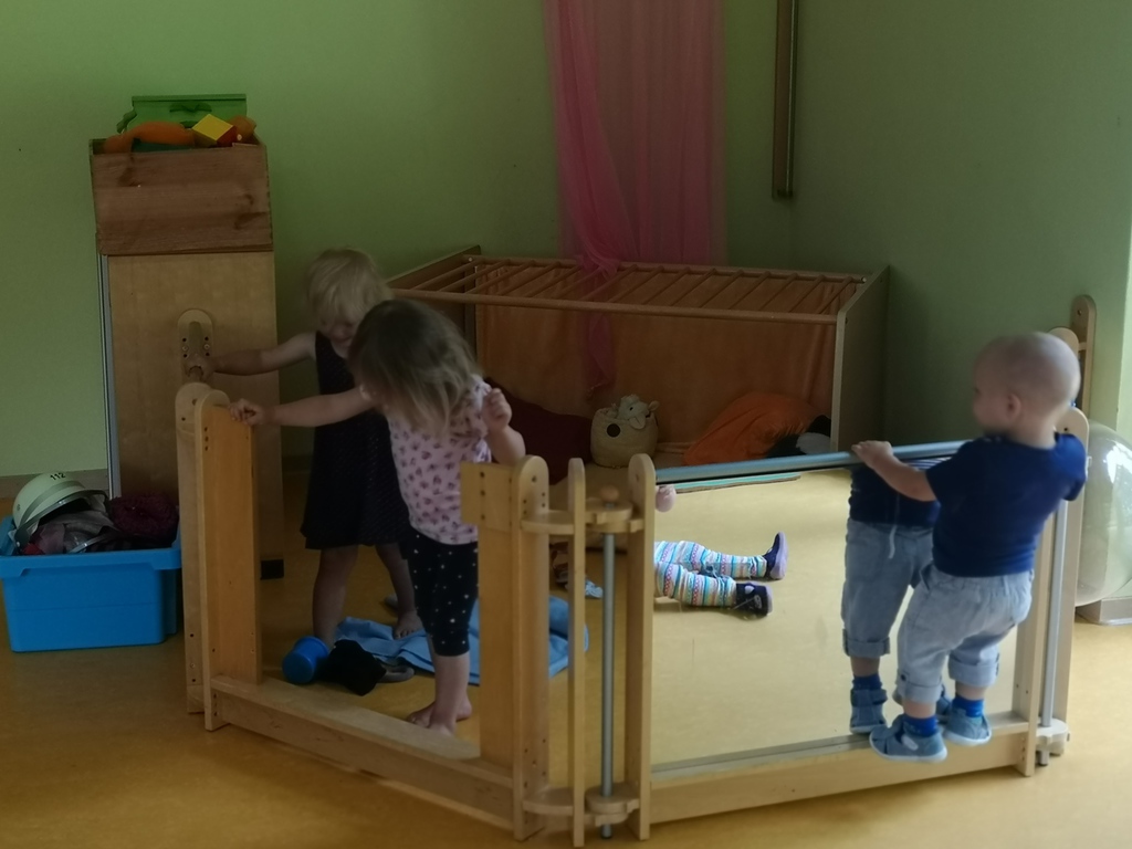 Die Spielebene mit Spiegel lädt dazu ein, seinen Körper und die eigene Fortbewegung zu erkunden und zu fördern.