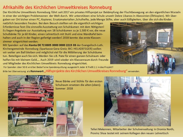 Der Kirchliche Umweltkreis Ronneburg führt seit 2017 ein privates Hilfsprojet zur Bekämpfung der Fluchtbewegung an den eigentlichen Wurzeln in einer der wichtigen Problemzonen der Welt durch. Wir unterstützen eine Schule unweit Debre Libanos in Abessinien (Äthiopien). Der letzte Besuch war am 15. Januar 2017. Wir übergaben einen PC, Kopierer, Ersatzmaterialien, Schulhefte, jede Menge Stifte, aber auch Süßigkeiten, über die sich die Kinder natürlich besonders freuten. Dabei stellten wir vor Ort die eigentlich wichtigen Erfordernisse fest: Die sinnvolle Ausstattung von Schulräumen mit dem Nötigsten! Es liegen nun Angebote zur Ausstattung von 18 Schulräumen zu je 1.500 € vor, die neue Schulbänke für je 60 Kinder, einen Lehrertisch mit Stuhl und eine Wandtafel beinhalten und auch vor Ort in der Region gefertigt werden!